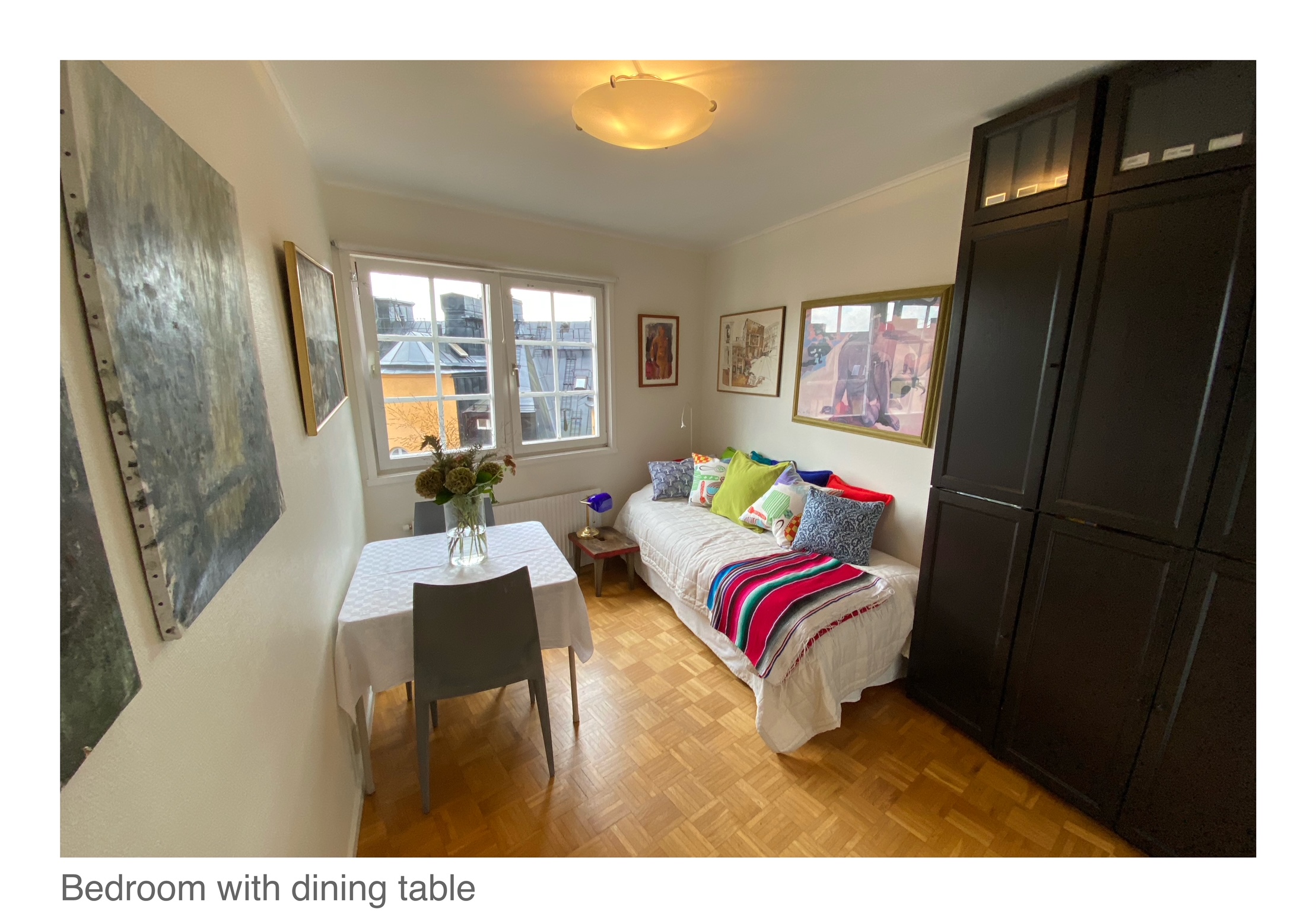 English description below: Högst upp i fastigheten ligger denna ljusa lägenhet (söderläge) på Östermalm. Den består av två rum av samma storlek, en separat privat toalett och egen dusch. Lägenheten har en enkel kokvrå och åtskilliga garderober. Läget är optimalt för den som trivs med att bo på Östermalm centralt i Stockholm i en tyst omgivning. Stureplan ligger inom 10 minuters promenad från adressen. Kungliga Tekniska Högskolan och tunnelbana ligger 500 meter bort där även Lill-Jansskogen tar vid. Parkerna Humlegården och Eriksbergsparken ligger ett par kvarter bort; mataffärer ligger närmare än så. Området kryllar av restauranger. SATS gym ligger intill. Tekniskt blir hyresgästen inneboende i en bostadsrättslägenhet; lägenheten har en egen entré och är separerad med en uppsatt vägg. Lägenheten är därför helt privat. ENGLISH: This bright apartment (facing south) is located at the top of the building, in the Östermalm neighborhood. It consists of two rooms of the same size, a private separate toilet, and a shower. The apartment has a simple kitchenette and several wardrobes. The location is optimal for those who enjoy living in Östermalm in central Stockholm in quiet surroundings. Stureplan is a 10-minute walk from the address. KTH Royal Institute of Technology and the subway are 500 meters away, where the forest, Lill-Jansskogen, also starts. The parks Humlegården and Eriksbergsparken are a couple of blocks away; grocery stores are closer than that. The area is full of restaurants. Gym (SATS) across the street. Technically, the apartment contract will be a tenancy agreement for a live-in tenancy. The apartment has its own entrance and is separated by a wall. The apartment is therefore completely private.